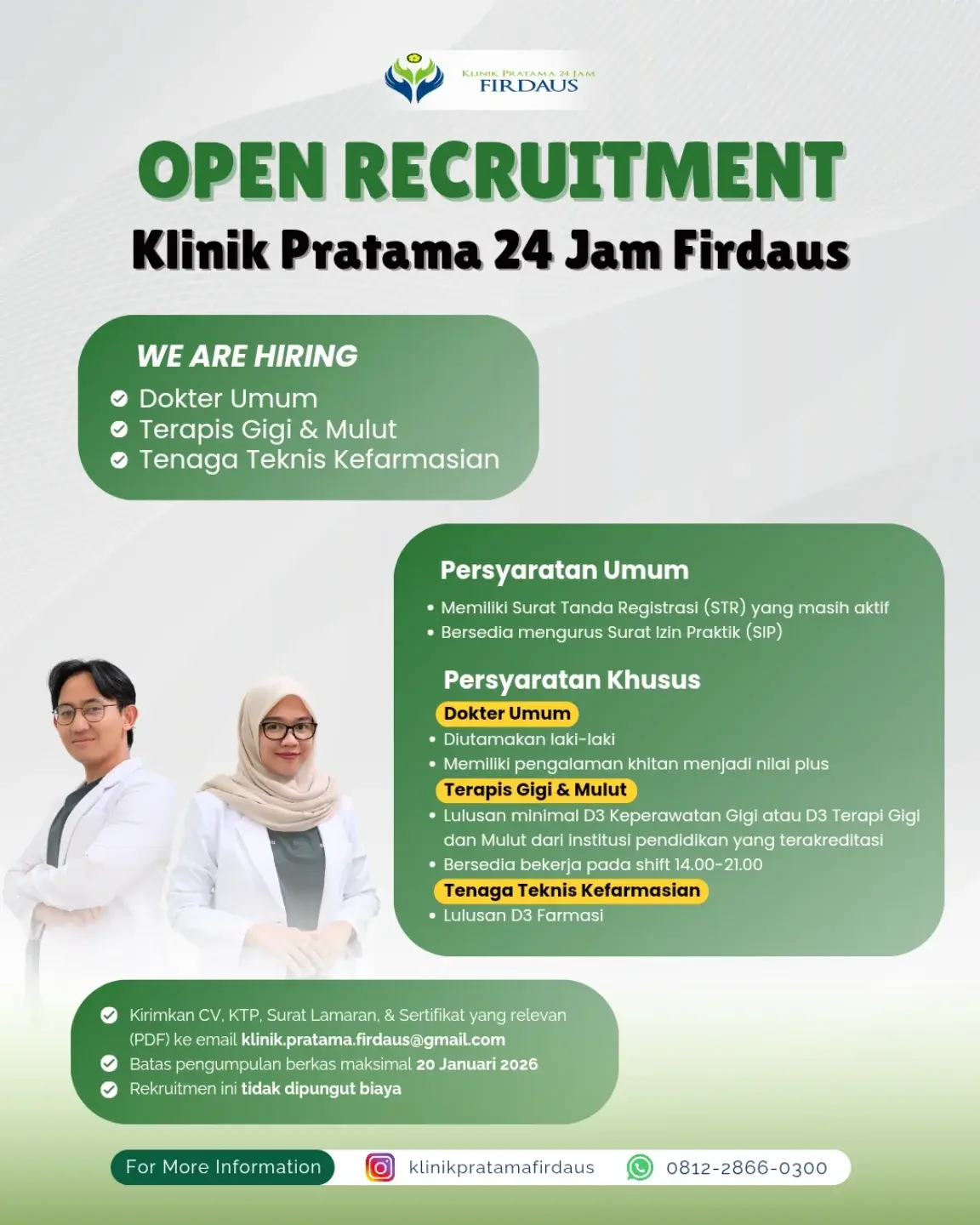 Dibutuhkan Terapis Gigi & Mulut untuk penempatan di Klinik Pratama Firdaus Yogyakarta. Untuk lamaran silahkan kirim melalui email yang tertera.